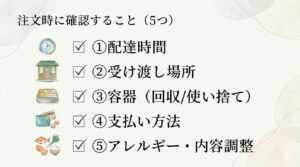 ③ 店に伝えるべきこと(配達・容器・支払い・アレルギー)