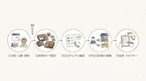 受け取り〜配膳までの“流れ”を決めると当日バタつきません。⑤ 人数変更・時間ズレのリカバリー方法