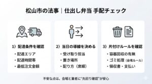 仕出し店:「でしたら、先に“配達の場所”と“受け渡しの時間帯”だけ決めましょう。人数は“幅”で大丈夫です。」